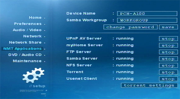 Всего Popcorn может поддерживать до семи NMT-сервисов: UPnP AV server, myiHome Server (для этого нужно скачать специальную программу, которая позволит расшаривать по сети папки с медиасодержимым, чтобы они были доступны Popcorn'у), FTP-сервер, Samba-сервер, NFS-сервер (сетевой файловый сервер, поддерживающий протокол NFS), Torrent-клиент и Usenet-клиент...