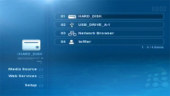 Проблем с инсталляцией не было, к плейеру прилагался цветной буклет Getting started, следовал ему: воткнул девайс в Ethernet порт домашнего роутера, подсоединил SATA диск и запустил визарда конфигурации. Плейер поставил апдейты, разметил жесткий диск и доложил о готовности к работе.