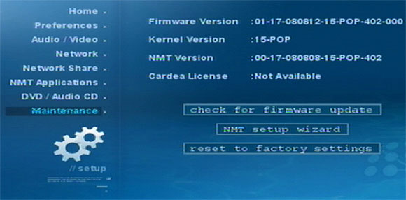 Тогда полез на форумы изучать ситуацию. На форуме увидел примерно три сотни тредов, посвященных самым разнообразным вопросам и проблемам, связанным с данным устройством, после чего быстро убежал с форума и полез на сайт производителя - изучать документацию. Там более или менее быстро выяснилось, что я рано присоединил Popcorn к компьютеру - сначала надо провести процедуру, так сказать, инициации. Для этого Popcorn подключается к телевизору (проектору), там в появившемся меню выбирается пункт Maintenance, а в нем - NMT setup wizard. С помощью этого мастера можно, во-первых, отформатировать жесткий диск в нужном формате, а во-вторых, с сайта производителя закачать на диск всякие NMT-сервисы, чтобы это потом заработало в комплекте с компютером. Отформатировал, установил сервисы.