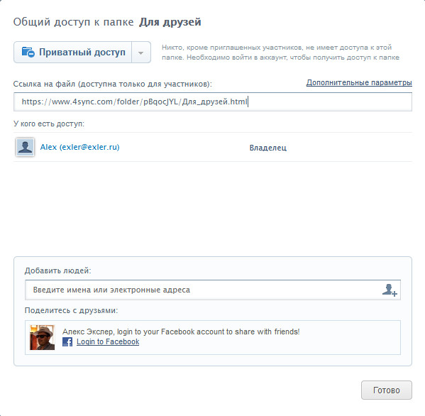 Также, если залогиниться в 4Sync со своим аккаунтом в Facebook, вы сможете давать доступ к папке своим друзьям из Facebook.