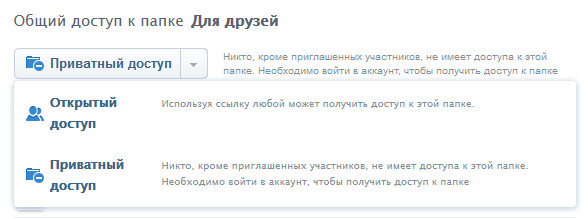 В случае когда вы хотите дать доступ к содержимому папки всем, кому известен адрес этой папки, общий вид доступа нужно изменить с приватного на открытый.