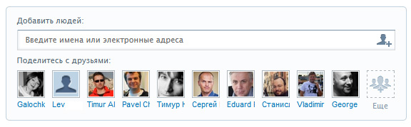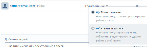 Список людей, с которыми вы хотите поделиться содержимым данной папки, можно задавать в виде их электронных адресов: при этом для каждого адреса настраивается вид доступа - только для чтения или для чтения и записи.