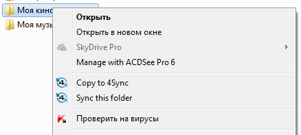 Кроме того, на нужной внешней папке можно щелкнуть правой кнопкой мыши - появится вот такое меню: папку можно скопировать в раздел 4Sync, а можно поместить его ярлык (это опция Sync this folder).