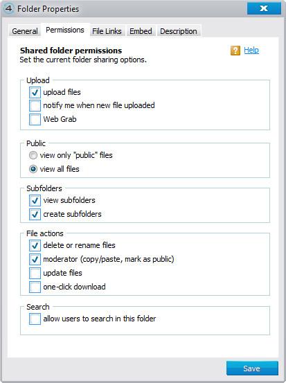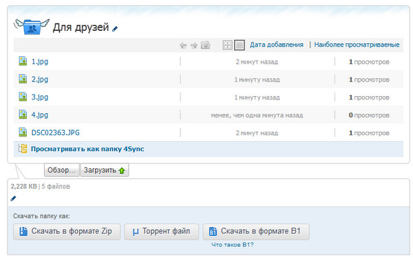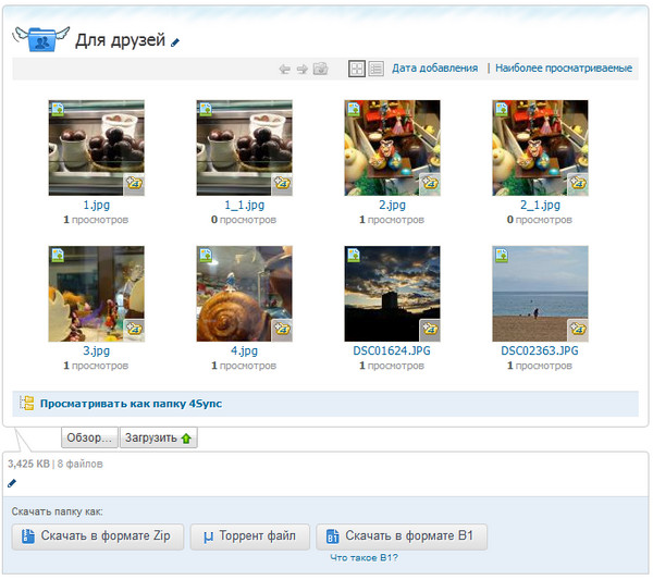 Пользователь может просматривать/скачивать как отдельные файлы, так и всю папку с содержимым (там могут быть и вложенные папки с файлами). Если это разрешено, он может, в свою очередь, загрузить что-то в эту папку - так очень удобно организовывать обмен фотографиями. Разумеется, новые загруженные файлы автоматом попадут в 4Sync на вашем компьютере.