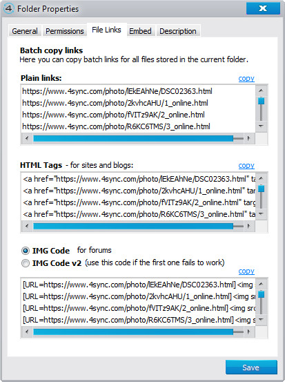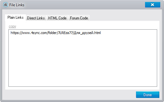 Get Link - получить ссылку на данную папку, прямую ссылку, html-код для вставки в веб-страницу или код для форума.