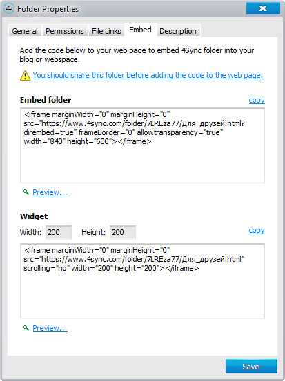 Коды для встраивания содержимого папки в Веб.