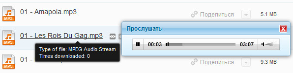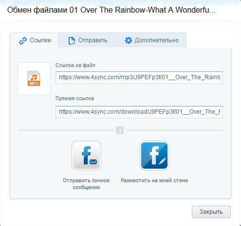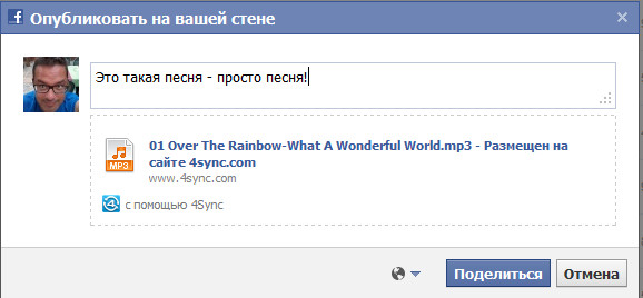 Кстати, если нажать "Поделиться" на аудиофайле, то там появится дополнительная возможность разместить его на стене в Facebook или отправить в личном сообщении Facebook.