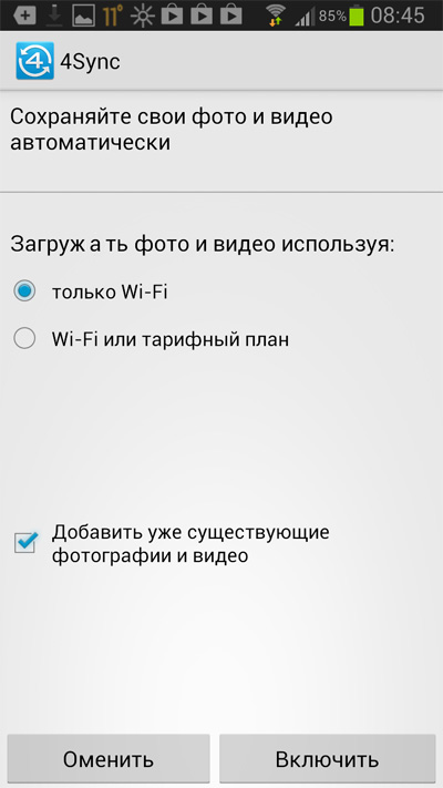 Вот, например, приложение под Android. При установке сразу спрашивает, нужно ли сохранять фото и видео, и если да, то что использовать ("только Wi-Fi" - очень полезная опция) и нужно ли загрузить все то, что там уже заснято.