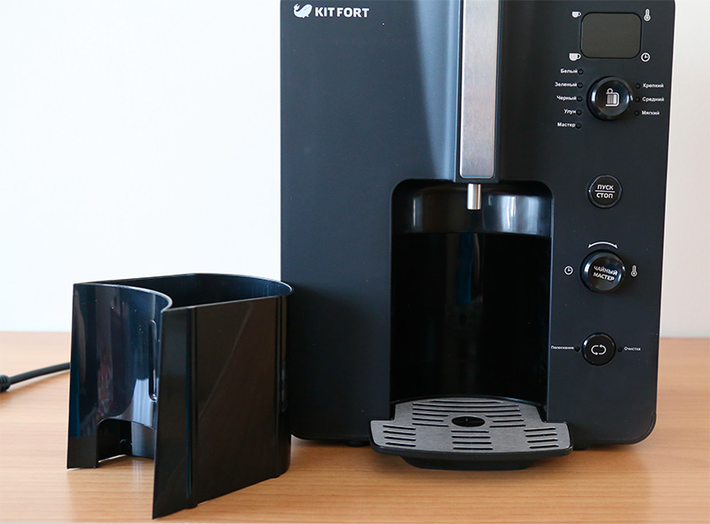 Перед самым первым приготовлением нужно провести очистку чаеварки. Для этого в контейнер наливается вода и нужно проверить, что контейнер для сбора воды после очистки установлен на своем месте. Соответствующей кнопкой выбирается "Очистка" и запускается.