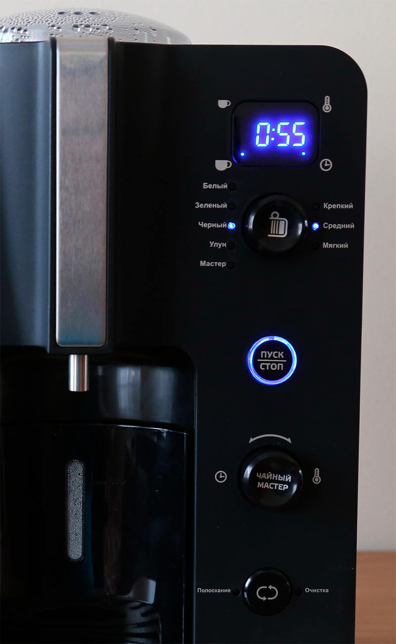 Нажатием на универсальную кнопку выбирается размер порции (я предпочитаю маленькую), поворотом выставляются вид чая и желаемая крепость заваривания.