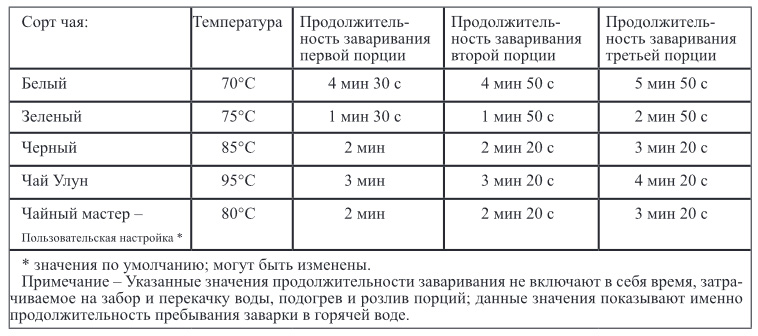 Общее время приготовления одной порции зависит от выбранных параметров. Для черного чая это обычно от трех до пяти минут.