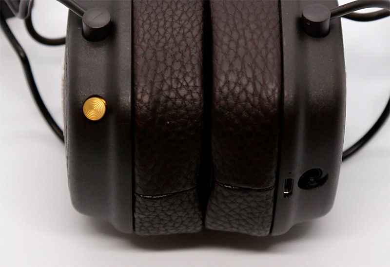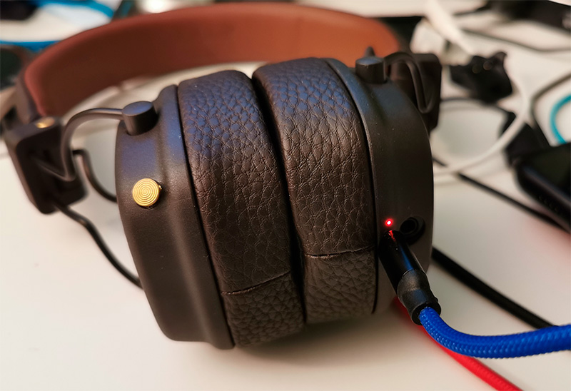 У этих наушников (как и у других беспроводных Marshall) есть забавная фича: в гнездо для проводного подключения можно воткнуть другие проводные наушники - и слушать звук одновременно в двух. Удобно, например, для поездок - вдвоем с одного планшета что-то смотреть.