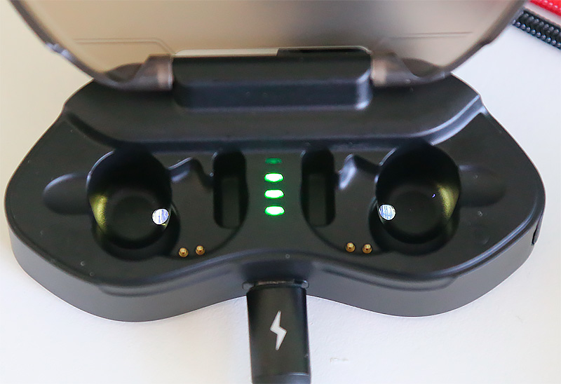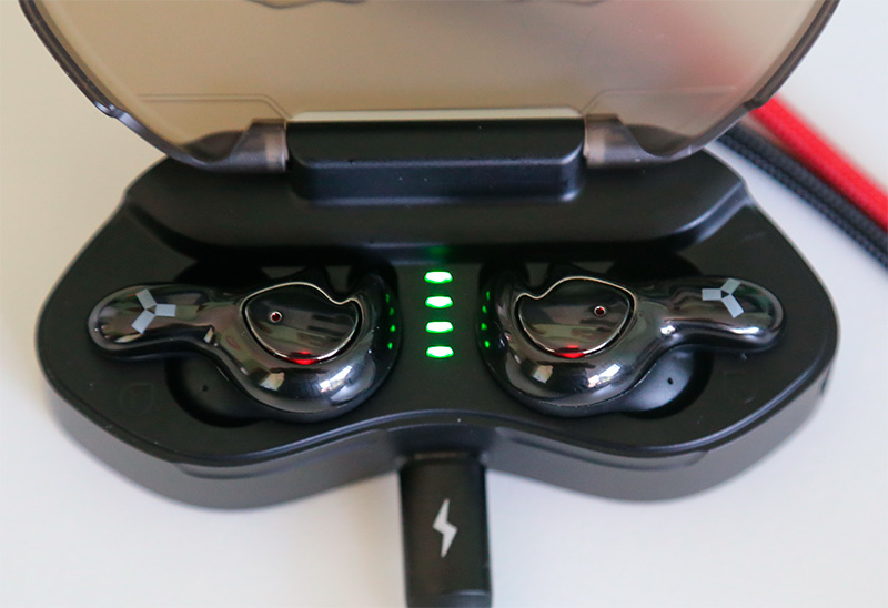 Когда наушники вставляются в кейс и начинают заряжаться - кейс четырьмя полосками индикатора зарядки докладывает о состоянии своего встроенного аккумулятора, наушники при этом начинают призывно подмигивать красным - прям дискотека двухтысячных! Выглядит реально эффектно.