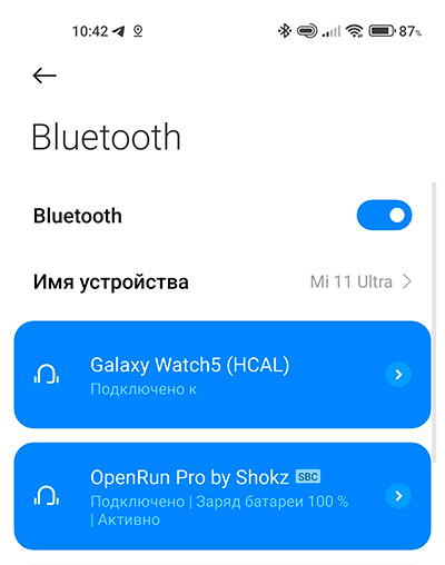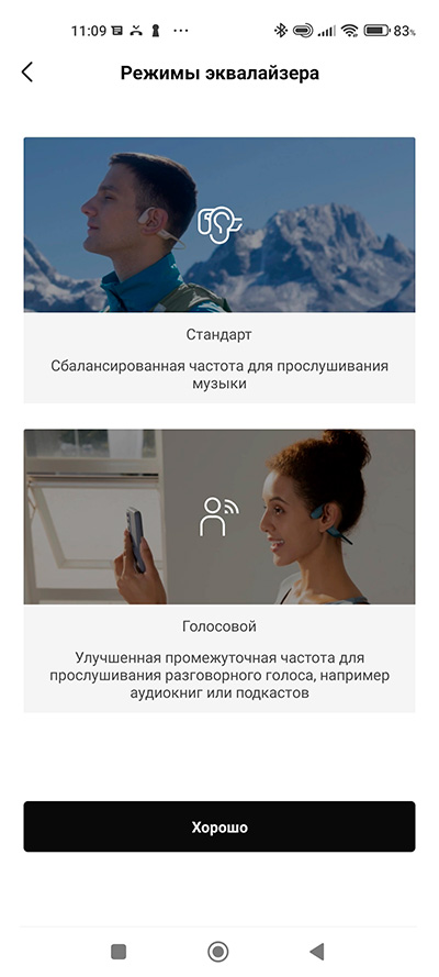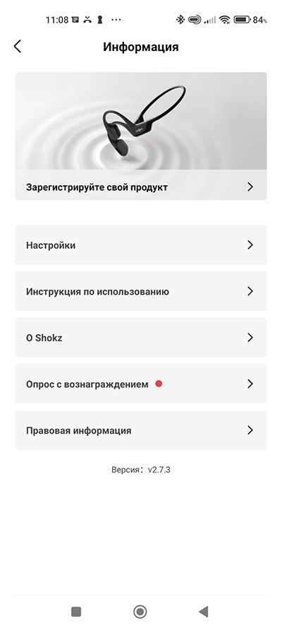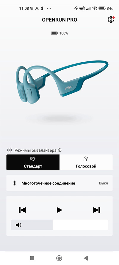 Наушники управляются через специальное приложение Shokz. Там выводится всякая справочная информация, можно менять режим работы наушников (есть предустановленные настройки эквалайзера под стандартный звук, и под голос), там можно управлять воспроизведением, настраивать громкость и включать/выключать мультипойнт, позволяющий использовать наушники сразу с двумя устройствами. Также через это приложение обновляется прошивка наушников.