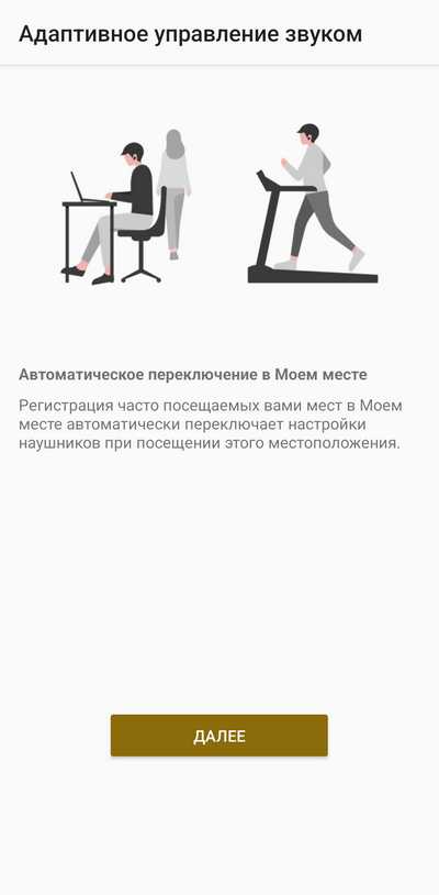 Адаптивное управление звуком может автоматически переключать настройки при определении местонахождения пользователя: дом, работа, на улице и так далее.