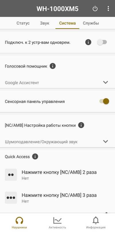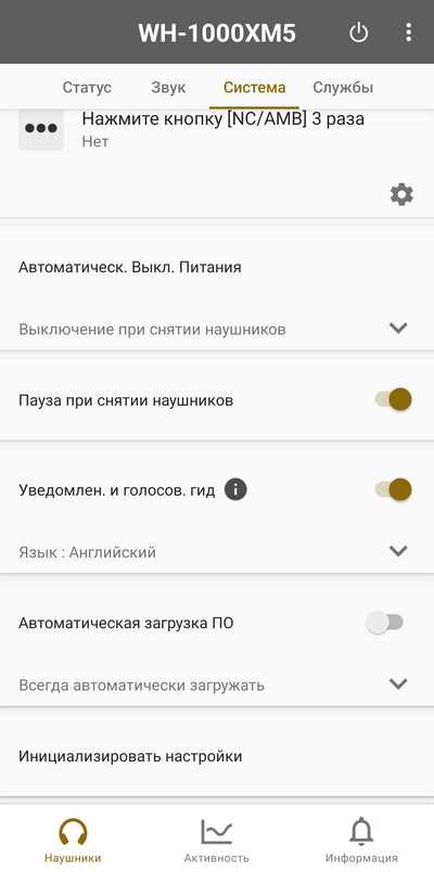 Настройки системы. Тут немало интересного. Включение режима мультипойнт (два устройства одновременно, однако при этом не будет доступен кодек LDAC), отключение сенсорной панели (если это зачем-то нужно), настройки кнопки шумодава, включение паузы при снятии наушников, автоматическое выключение наушников (очень полезная штука) и так далее.