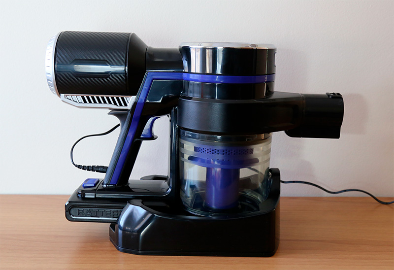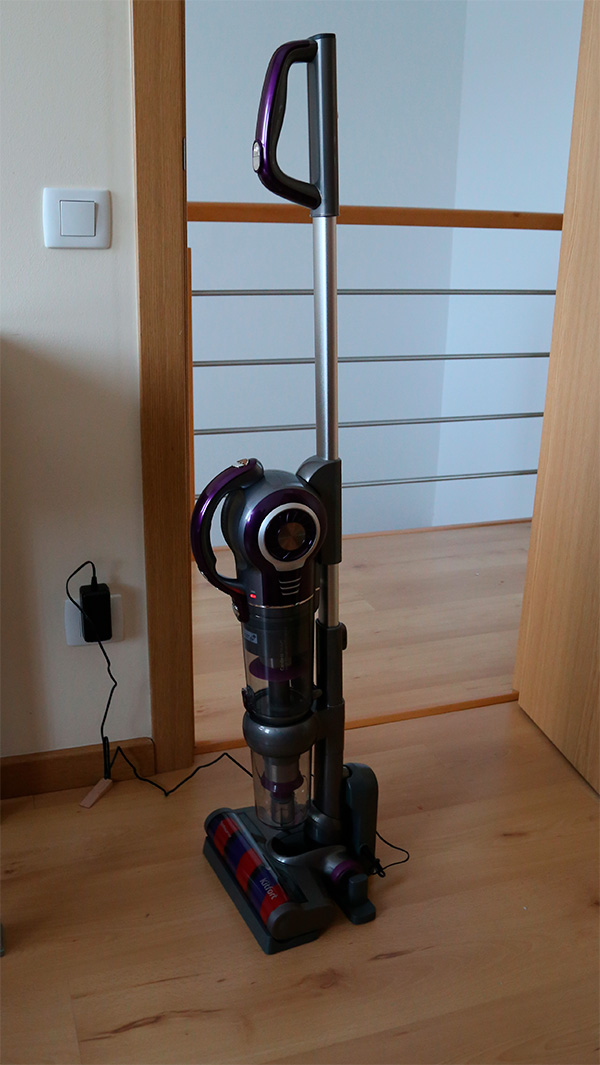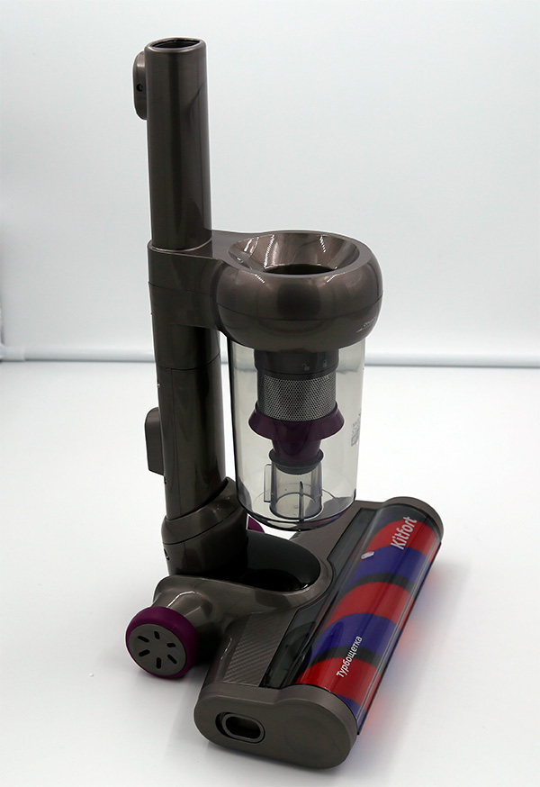 Ну и вот пылесос в сборе. В турбощетку вставляется удлинительная ручка, в циклонный фильтр вставляется корпус пылесоса, вся конструкция вставляется в подставку - пылесос в сборе.