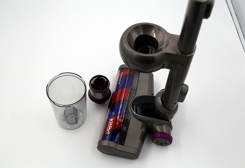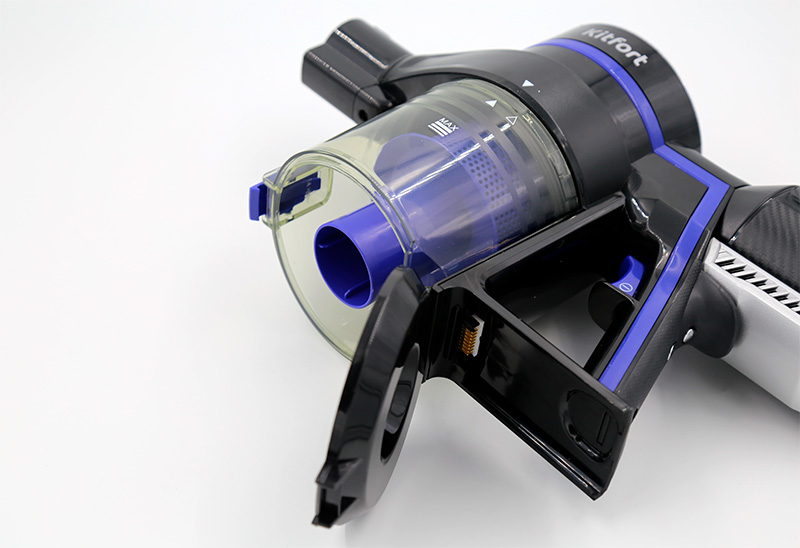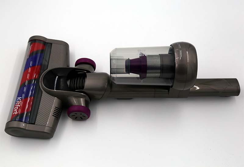 Корпус пылесоса с циклонным фильтром. Всасывающая горловина одновременно является крышкой мусорного контейнера: она легко открывается одной кнопкой для освобождения контейнера. На корпусе пылесоса четыре кнопки: включение обычного режима, включение турборежима, кнопка для снятия циклонного фильтра и кнопка для отсоединения пылесоса от удлинительной ручки с турбощеткой.