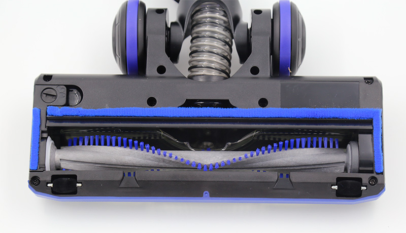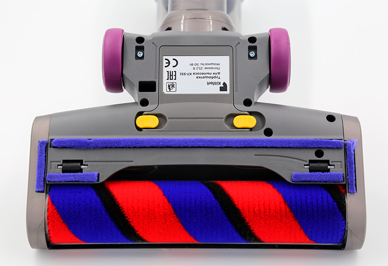 Теперь о том, как это все работает в сборе. Благодаря тому что корпус пылесоса устанавливается в циклонный фильтр турбощетки, а всю эту конструкцию вы возите (ну, хорошо, я ее вожу, я) за ручку, тут управлять турбощеткой легко и удобно. На рукоятке ручки дублируются кнопки включения-выключения и турборежима. Перемещение пылесоса не требует никаких усилий, наоборот, так как турбощетка тут имеет плотный валик, он создает хорошее сцепление с полом и пылесос практически сам катается по комнате, вы его просто направляете.