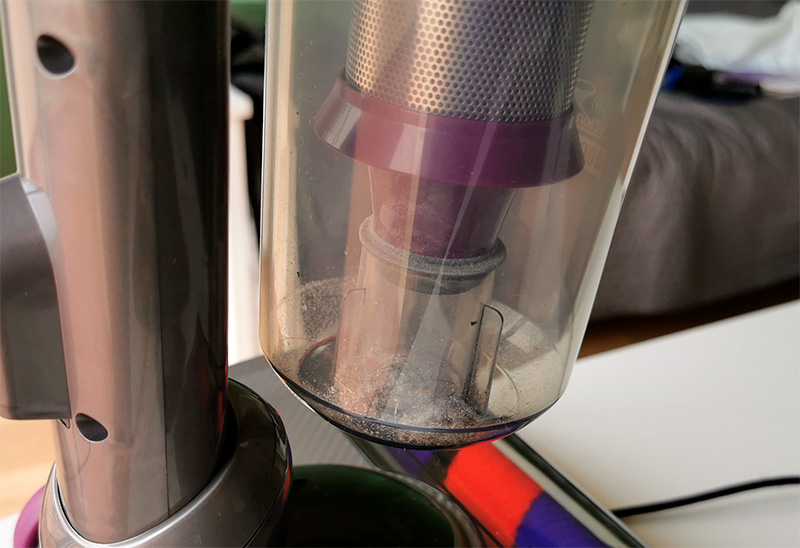 Пылесосит устройство достаточно эффективно, контейнер опорожняется за пару секунд, циклонный фильтр легко разбирается и промывается.
