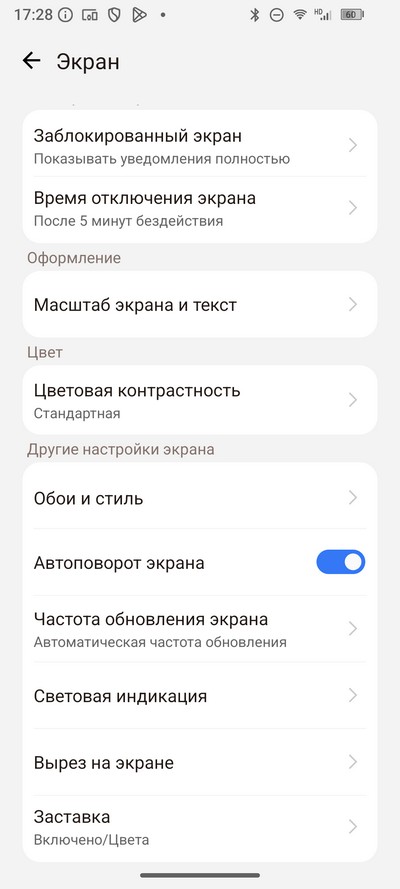 Настройки экрана - стандартные для Android. Есть темный режим, режим чтения, можно настраивать размер шрифта и масштаб.