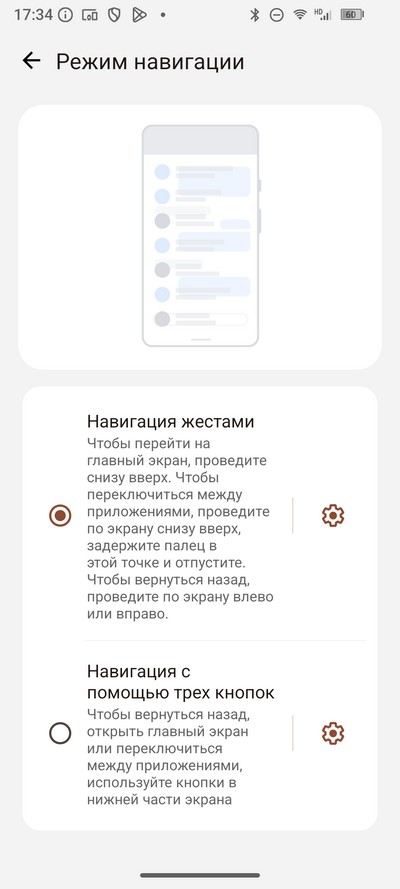Режим навигации - стандартные три кнопки или андроидные жесты.  Также настраивается "умная" кнопка и дополнительные жесты.