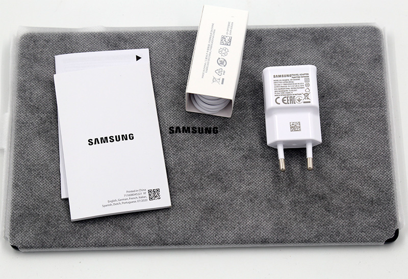 В комплекте: планшет в простеньком тканевом чехле, адаптер питания мощностью в 7,8 ватта, кабель USB - Type-C, инструкция.