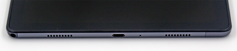 На нижней грани - аудиовыход, отверстия над двумя динамиками, порт Type-C, микрофон.