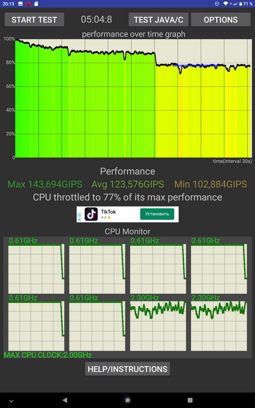 Тест троттлинга (падения производительности при нагрузке) - все терпимо: производительность почти не падала какое-то время, при сильной нагрузке все-таки через 4 минуты опустилась на 20%, но это совершенно нормально.
