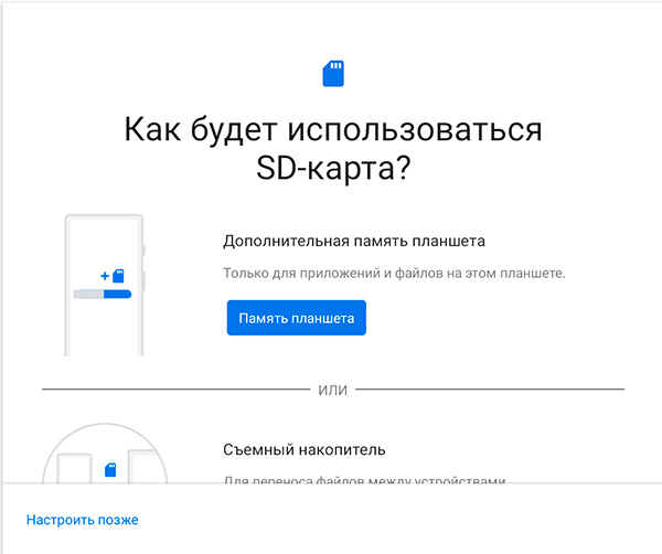 Если поставить в планшет карту памяти, то устройство предложит или присоединить накопитель к встроенной памяти (это удобно), или использовать карту как отдельный накопитель.