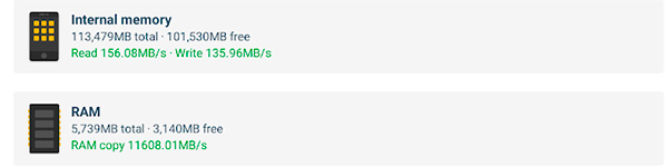 Тест скоростей памяти - оперативной и встроенной. Память небыстрая: по сравнению, например, со смартфоном Xiaomi Mi 11 Lite, оперативная медленнее раза в два, встроенная медленнее в три раза.