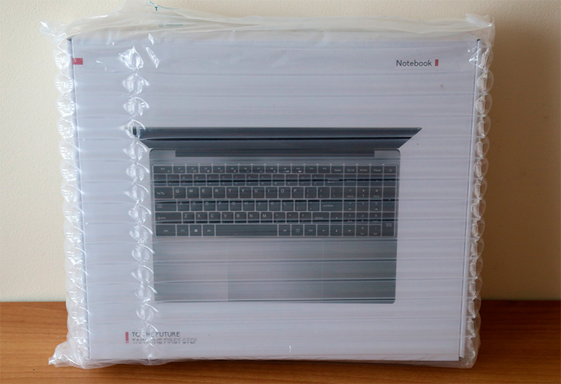 Коробка с ноутбуком. На коробке содержится гордая надпись: "Сделай первый шаг в будущее". Если они под будущим подразумевают покупку дешевого ноутбука - ну, я не знаю: по-моему, с их стороны это как-то очень самонадеянно.