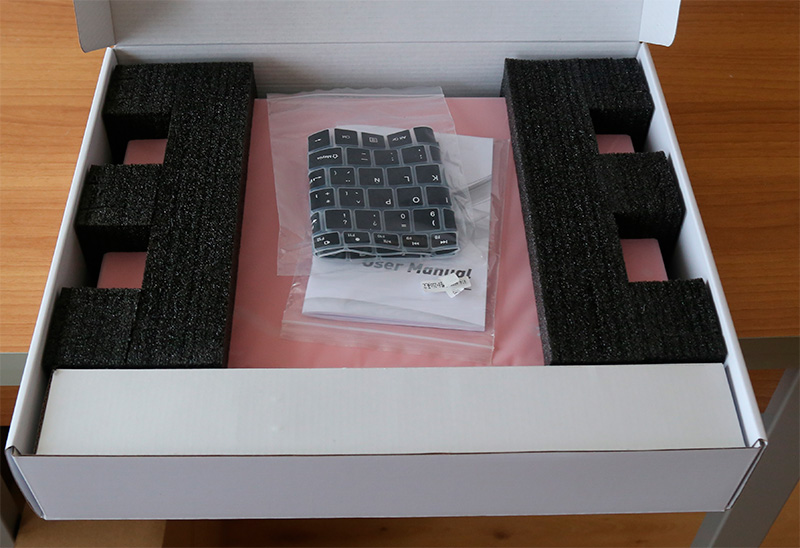 В коробке: ноутбук, адаптер питания, накладка на клавиатуру (мне приехала с испанской раскладкой, в Россию должна приезжать с кириллицей), руководство пользователя на английском.