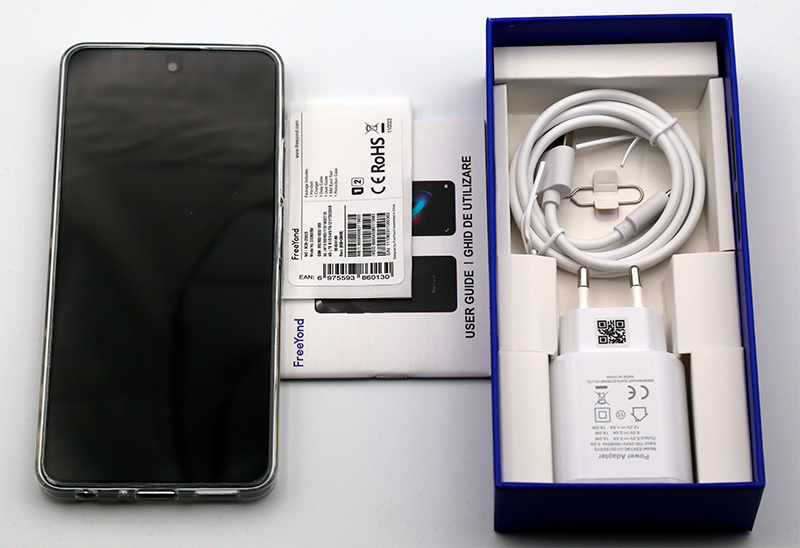 Комплект поставки: смартфон, силиконовый чехол, адаптер питания на 18 Вт, кабель для зарядки, инструмент для вытаскивания вставки под симкарты и карту памяти, руководство пользователя.