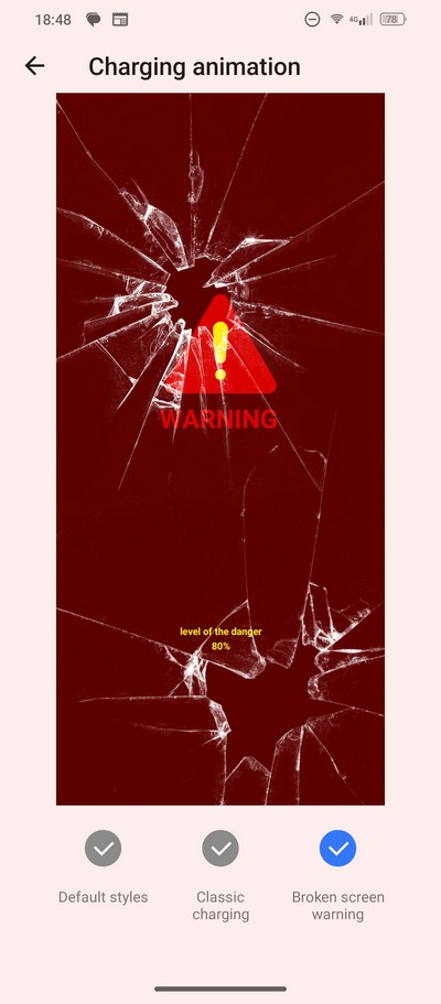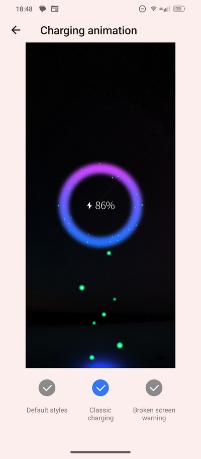Также оказалось, что здесь можно выбрать, как будет выглядеть анимация подключения зарядки. Кроме стандартного варианта есть еще пара таких.