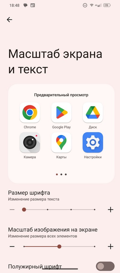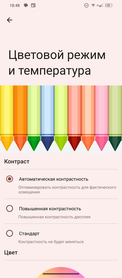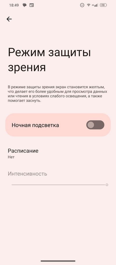 Настройки экрана - стандартные: настраиваются цветовой режим и температура, масштаб изображений и размер текста, режим защиты зрения (тёплые цвета). (Скриншоты настроек почему-то имеют розоватый оттенок, хотя в действительности там фон - белый. И такое проявляется только у настроек.)
