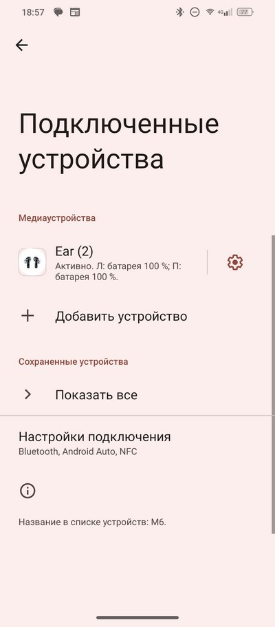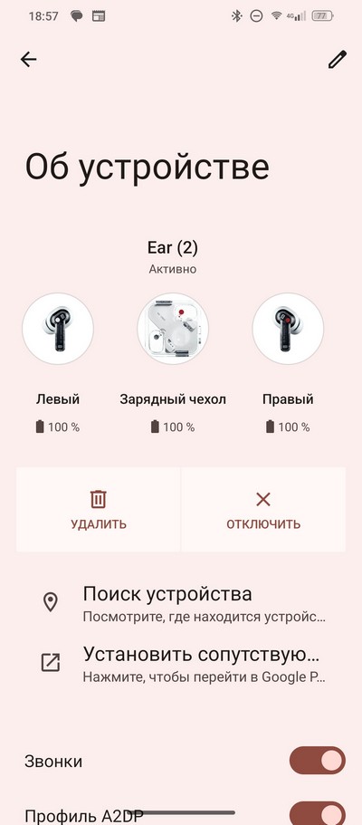 Для проверки беспроводного звучания подключил наушники Nothing Ear (2). Удивило то, что в карточке подключенного устройства мне показали уровень заряда и картинки каждого наушника и зарядного кейса - это круто.