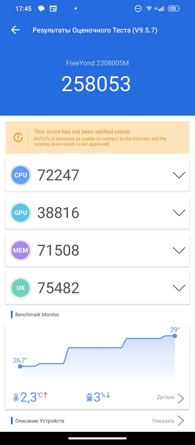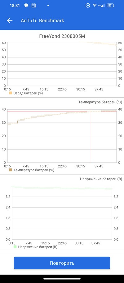 Стресс-тест AnTuTu. Максимальная температура батареи - 38 градусов.