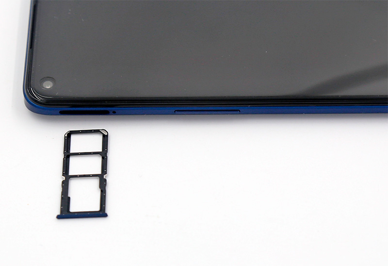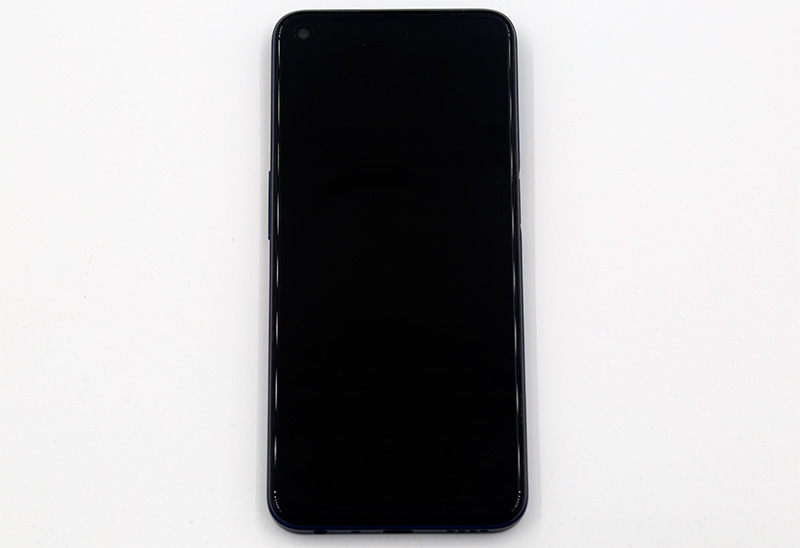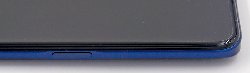 Дисплей покрыт стеклом 2.5D со слегка скругленными краями. Рама смартфона сделана из металла, боковые грани покрашены синим цветом.