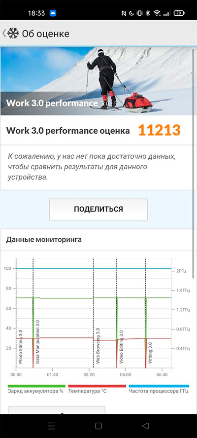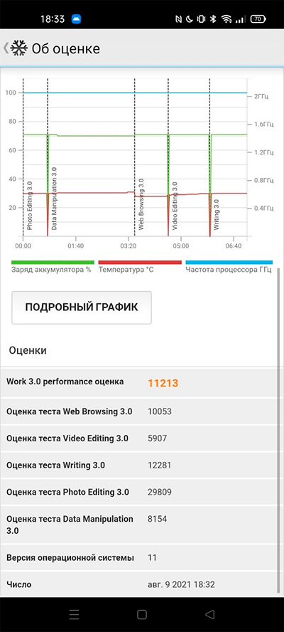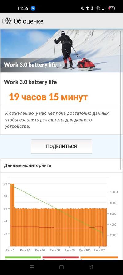Синтетический тест PCMark - важный показатель. Девятнадцать часов - хороший показатель, это означает, что при постоянной высокой загрузке смартфон спокойно продержится сутки. Кстати, у Poco M3 Pro - 14 часов 39 минут.