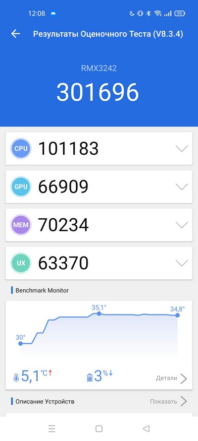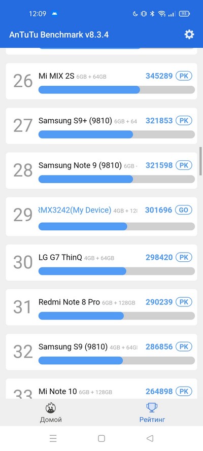 Тест по AnTuTu. Почему-то заметно больше, чем у Poco M5 Pro, хотя платформа одинаковая. (Там - 267 тысяч.)