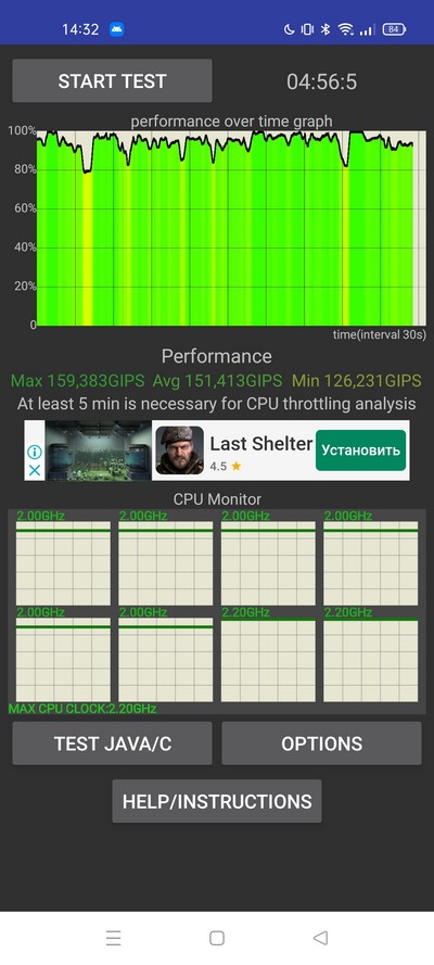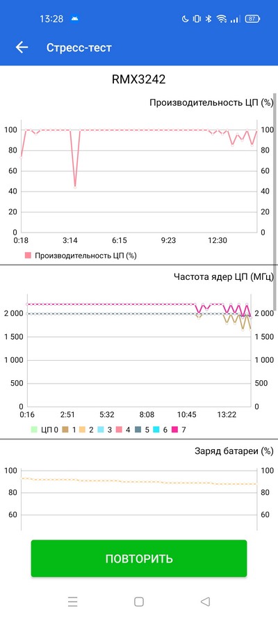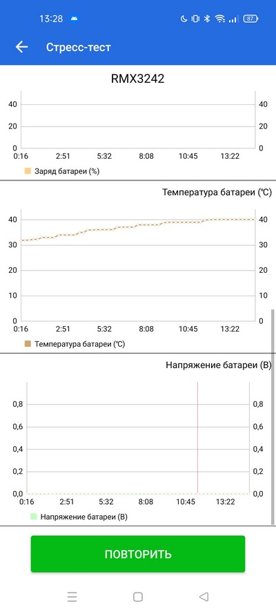Стресс-тест. Производительность не падает вообще, температура поднялась максимум до 40 градусов - это совершенно нормально.