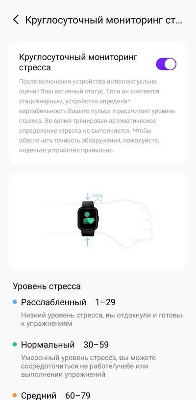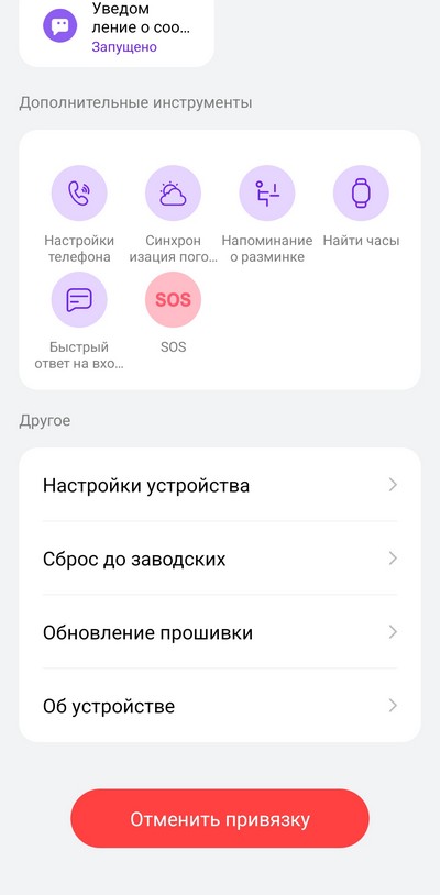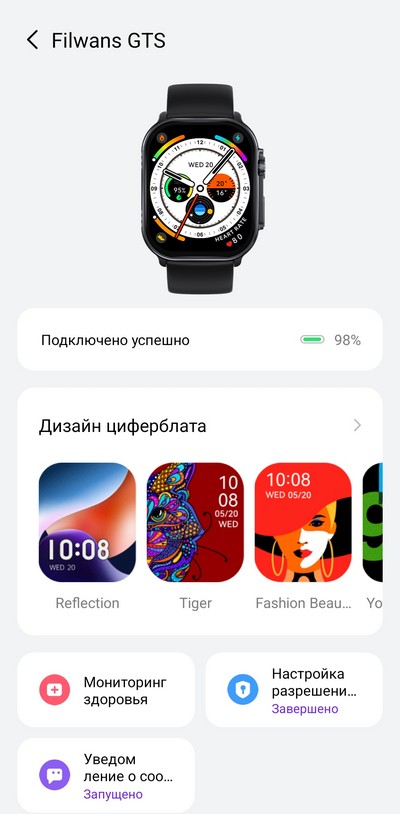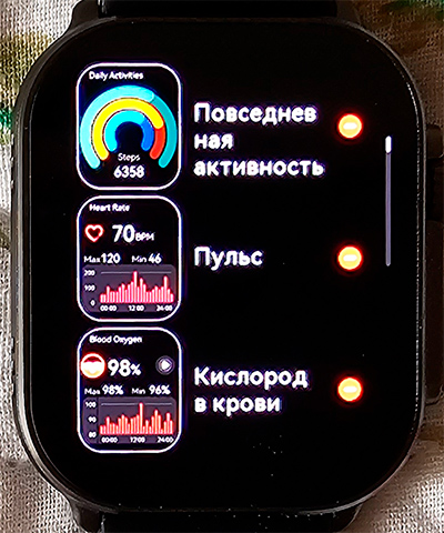Задается мониторинг пульса, стресса, уровня оксигенации. Также можно задать быстрые ответы на звонок (на уведомления здесь быстрых ответов нет).