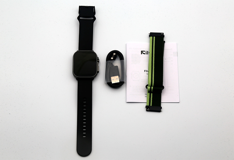Комплектация: часы с силиконовым ремешком, магнитный адаптер для зарядки, второй матерчатый ремешок, руководство пользователя.
