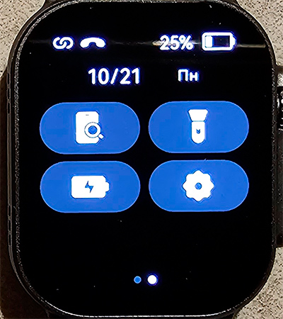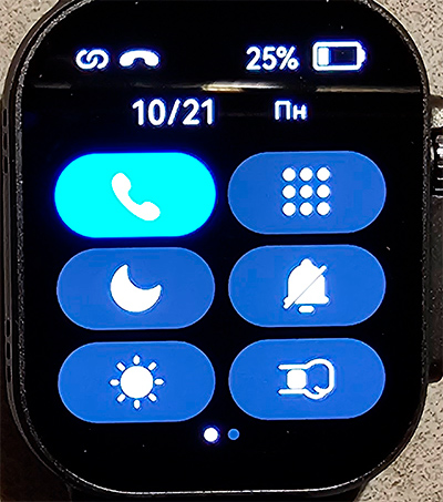 Свайп от экрана вниз - область быстрых переключателей: прием звонков на часах, вид окна приложений (список, значки), режим не беспокоить, выключение звука, яркость, положение на руке (правой или левой), поиск телефона, фонарик, энергосбережение, настройки.