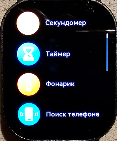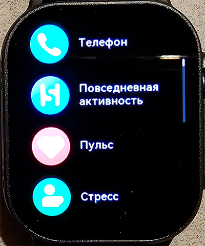 Нажатие нижней кнопки вызывает меню спортивных режимов, нажатие верхней кнопки - пиктограммы установленных в часах приложений: телефон, активность, пульс, стресс, тренировка, журнал тренировок, кислород в крови, сон, музыка, погода, будильник, частота дыхания, настроение, дыхательные упражнения, сообщения, голосовой помощник, SOS, женское здоровье, секундомер, таймер, фонарик, поиск телефона, удаленная камера, калькулятор, настройки.