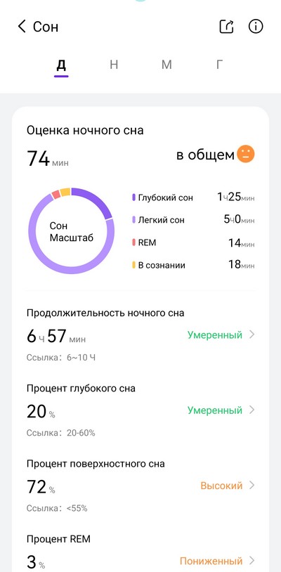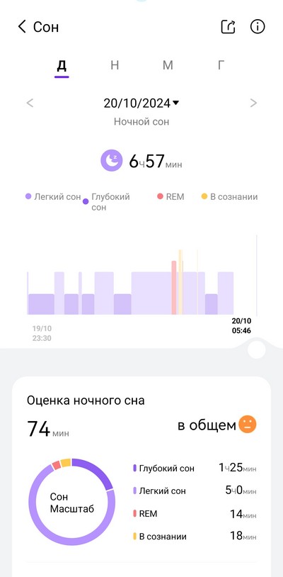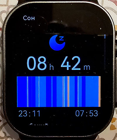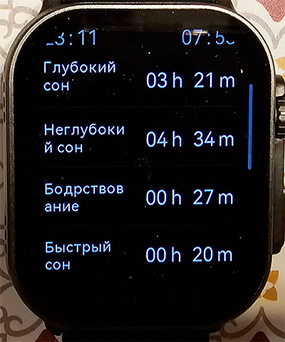 Мониторинг сна - неплохо, измерялся достаточно точно. Однако в отличие от многих других часов, которые при просыпании фиксируют окончание сна и уже его не определяют при засыпании, здесь часы скорее игнорировали просыпание, и показывали общую продолжительность сна без учета бодрствования.