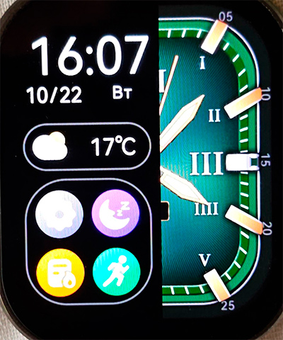 На циферблате свайп вправо - время с датой и днем недели, погода, пиктограммы приложений.