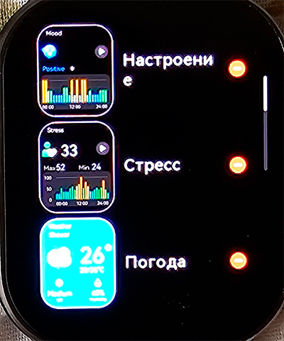 На циферблате свайп влево - виджеты приложений, где ненужные можно убирать. Набор там тако: повседневная активность, пульс, кислород в крови, настроение, стресс, погода, аудиоплеер, частота дыхания, сон, телефон, тренировки. Также вы можете настраивать их порядок.
