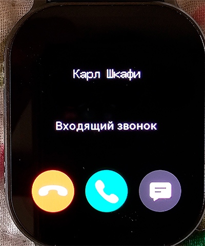 Свайп от циферблата вверх - список уведомлений, при нажатии на уведомление его можно прочитать. Входящий звонок: на него можно ответить прямо с часов, также можно отклонить звонок предустановленным сообщением, которые редактируются в приложении на смартфоне.